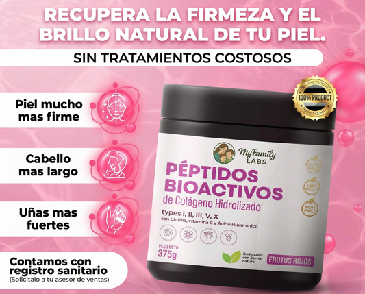 Péptidos Bioactivos de Colágeno Tipo I,II,III,V, X con Biotina, Ácido hialurónico, vitamina c (375 gr)